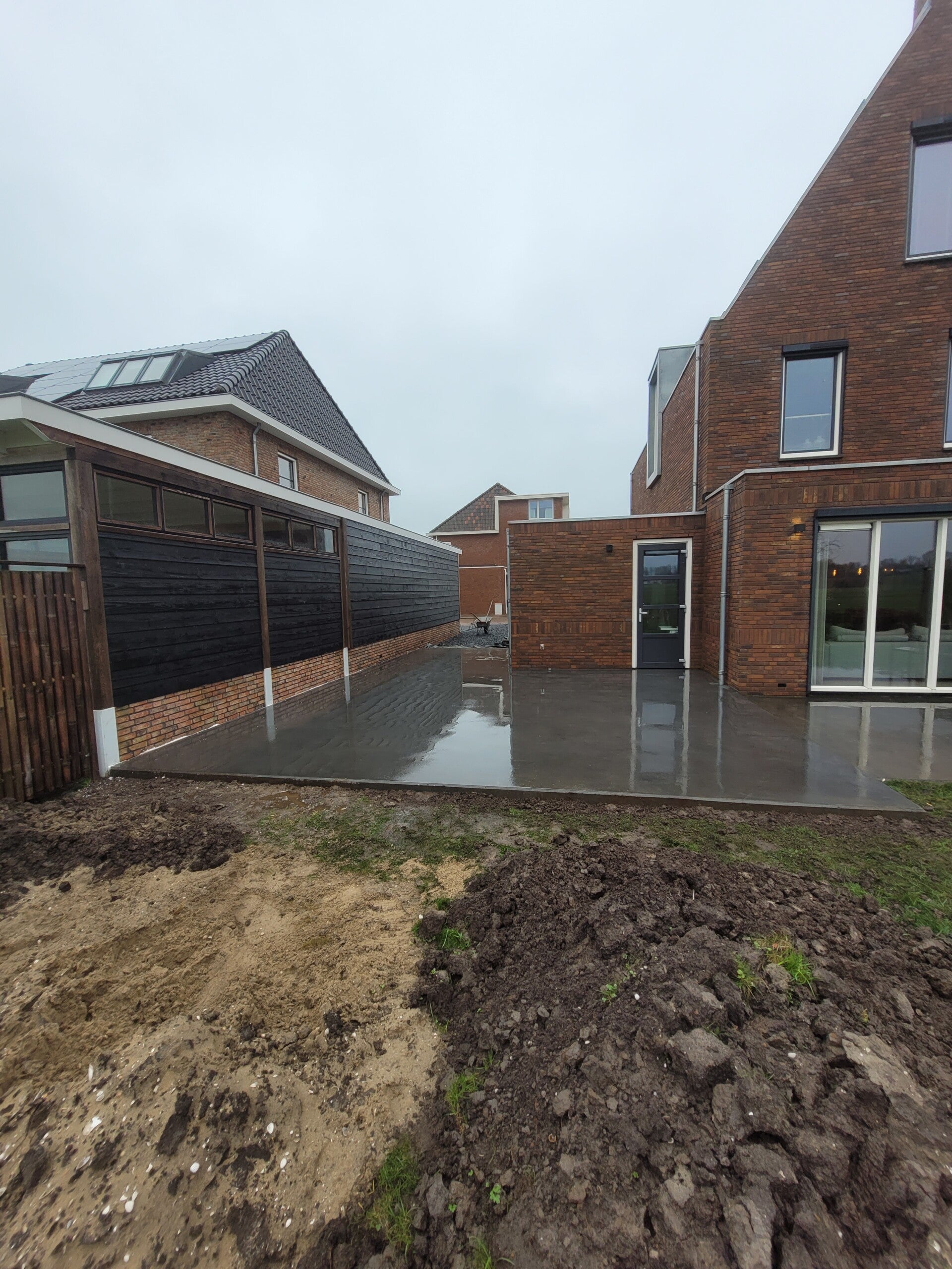 In Noorden hebben wij een stevig terras gerealiseerd. Na het uitgraven van de tuin zijn eerst stalen buispalen geheid om een solide fundering te creëren. Vervolgens hebben wij het terras gestort, voorzien van een antraciet kleurstof en zorgvuldig gevlinderd voor een strak en slijtvast oppervlak.